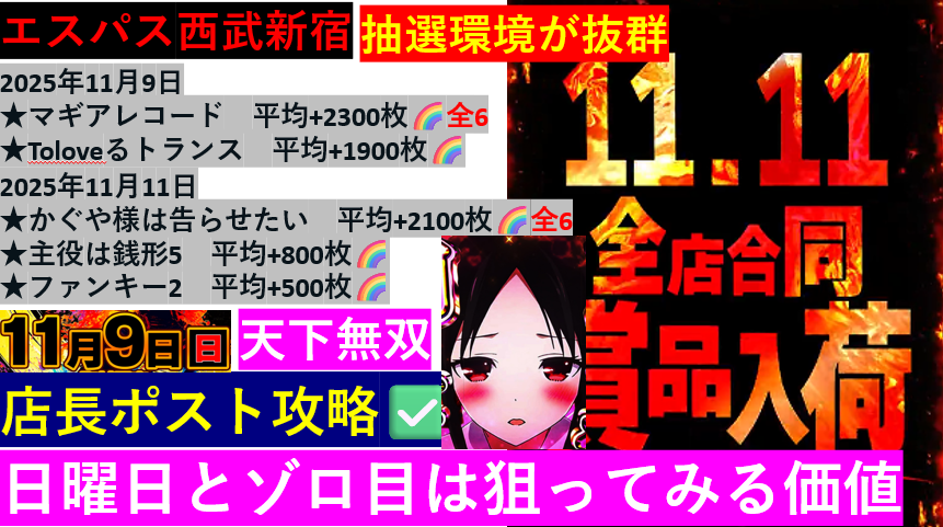 エスパス西武新宿/上野新館・本館/新宿歌舞伎町/渋谷本館/みとや大森 https://twitter.com/info777slot/status/1999887729405133186