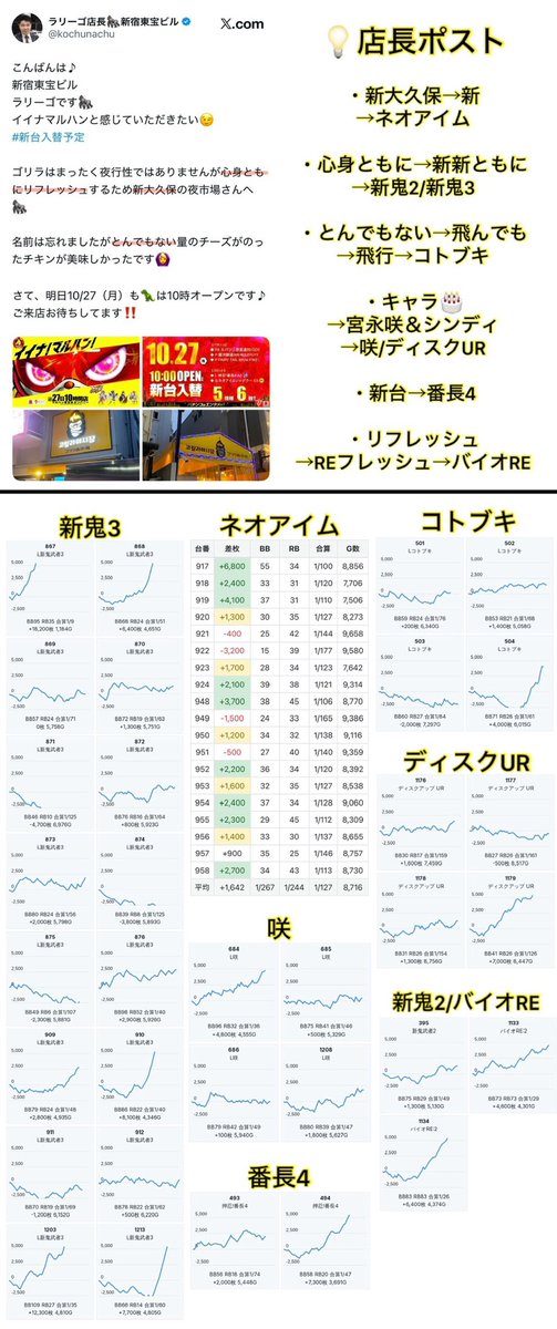 ・ネオアイム +15/19台 平均+1,642枚 https://twitter.com/slot_ogikiti/status/1979404182026359100