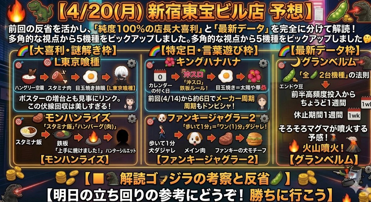 【マルハン新宿東宝】2026/4/20(月)高設定機種予想【パチスロデータ分析】|設定大好き!シゴロちゃん 🎲
