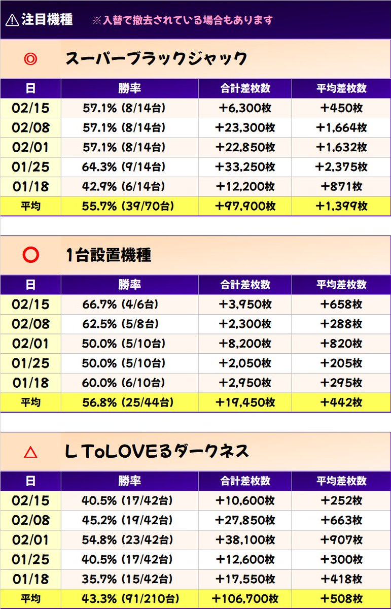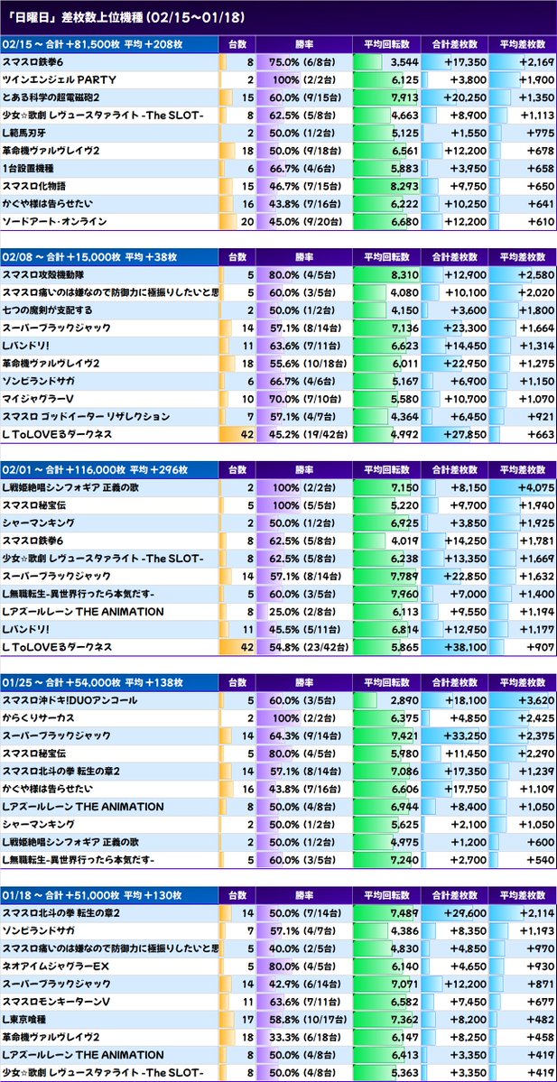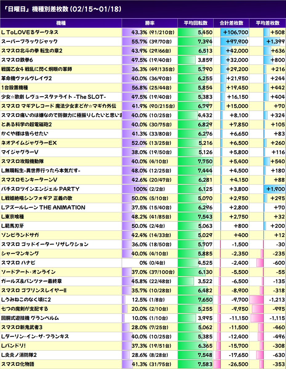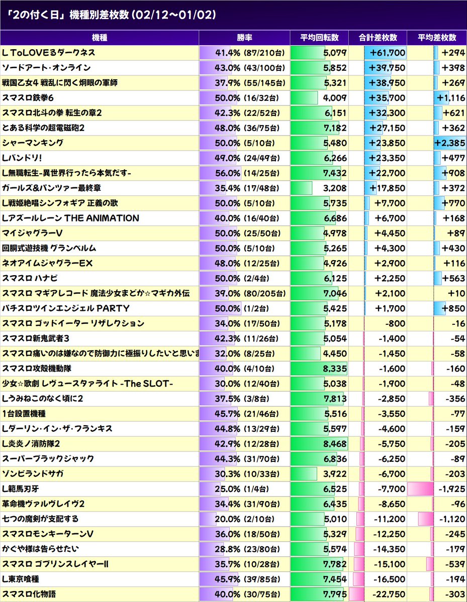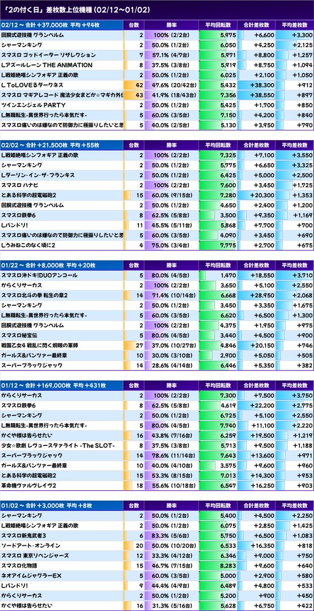 02/02 合計 +21,500枚 平均 +55枚(156/392台)