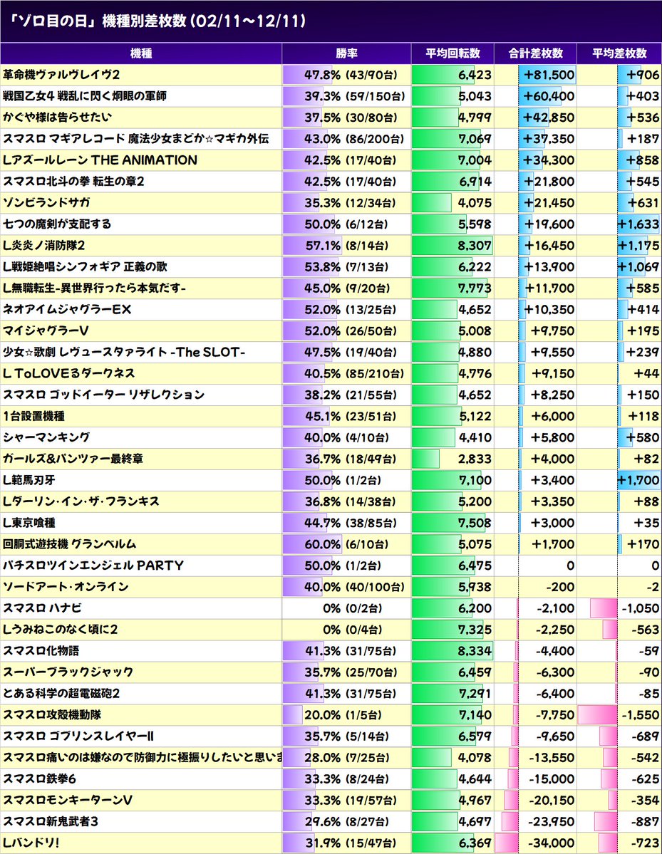 02/11 合計 +110,500枚 平均 +282枚(170/392台)
