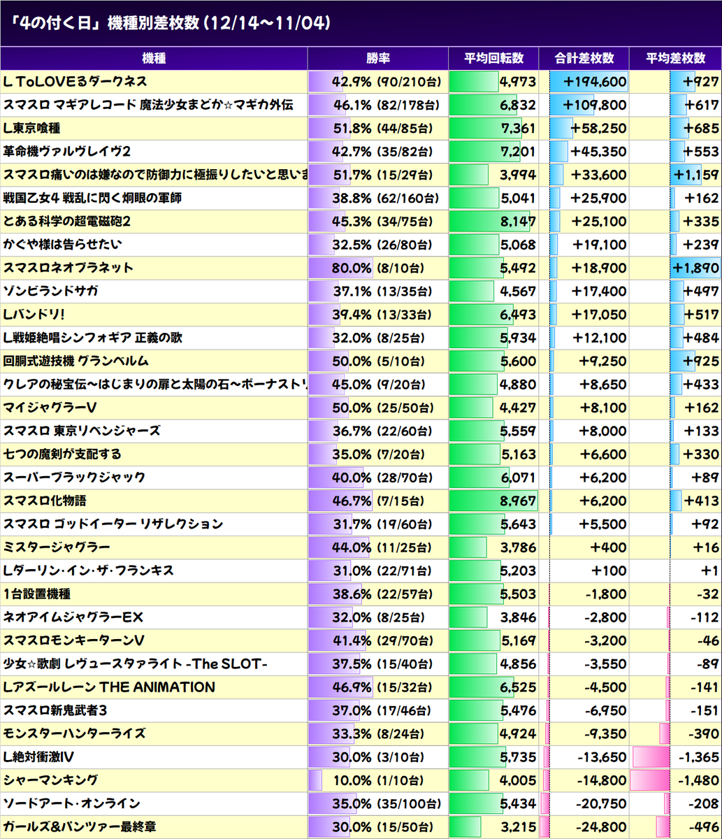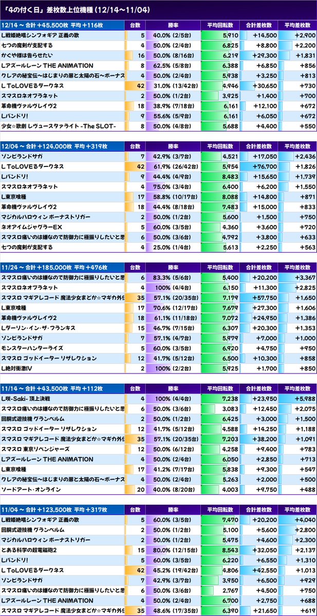12/04 合計 +124,000枚 平均 +319枚(161/389台)