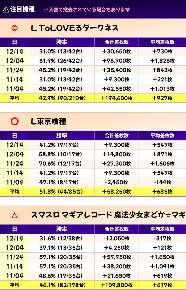 12/14 合計 +45,500枚 平均 +116枚(144/392台)