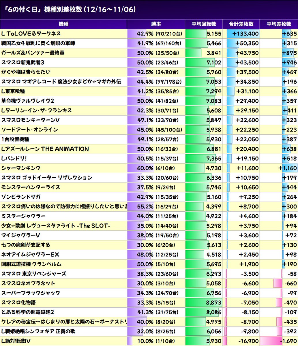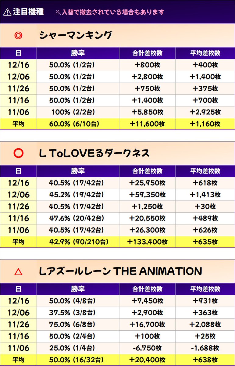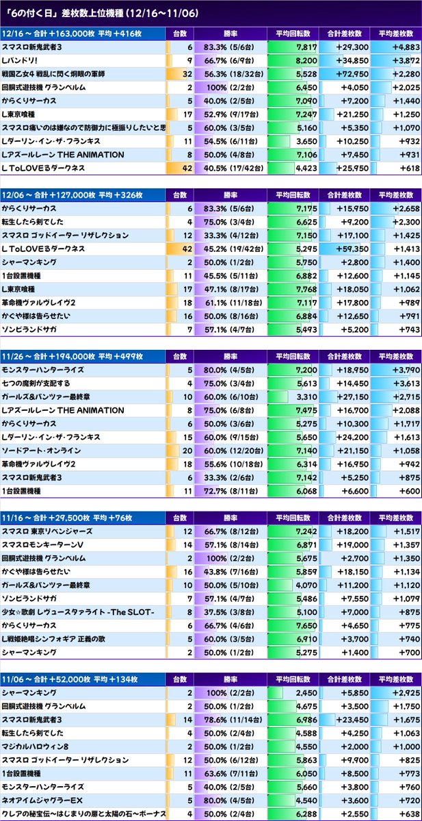 11/26 合計 +194,000枚 平均 +499枚(184/389台)