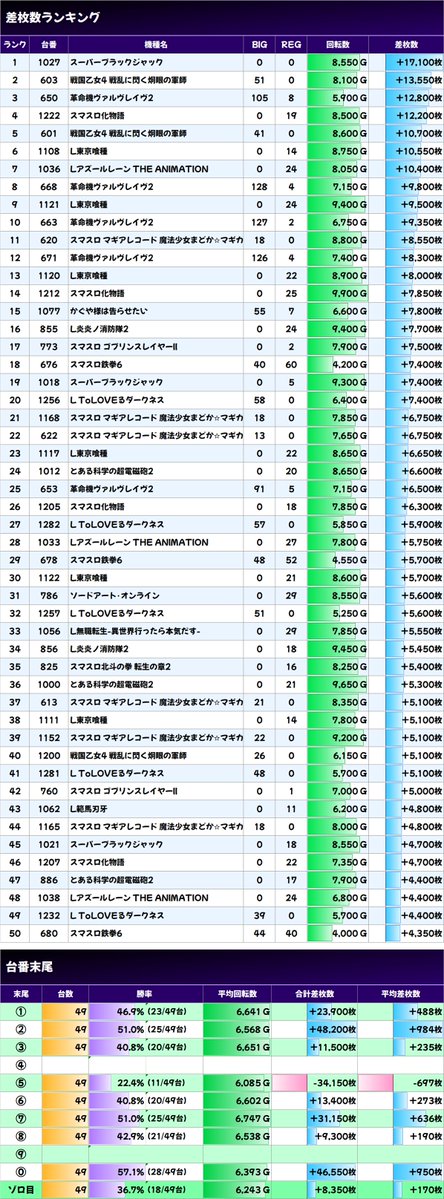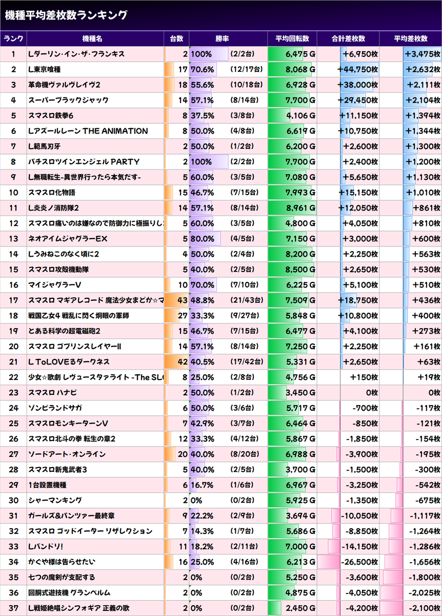 ✨平均差枚数上位機種✨