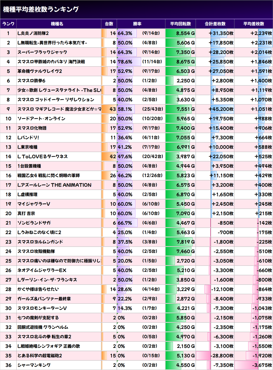 ✨平均差枚数上位機種✨