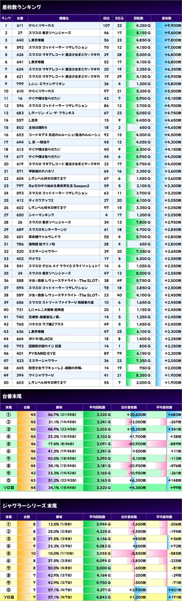 周年日ということで初めて訪問。20時くらいでスランプグラフの高設定記録は2列(10席くらい)に1台程度。この1年ジャグラーには力を入れないみたい。周年日に1/4も空席になるんだと驚きました。