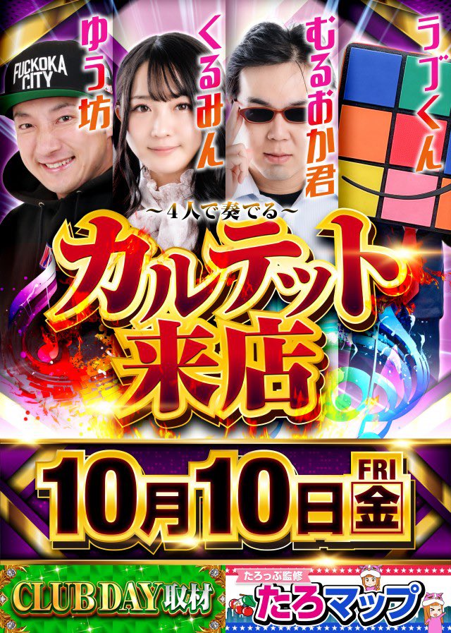 明日はクラブハウス庄内店のゾロ目の日にゆう坊さん、むるおか君、くるみんさん 、JJくんのカルテット来店❗ https://twitter.com/warukunv/status/1976185625624924471