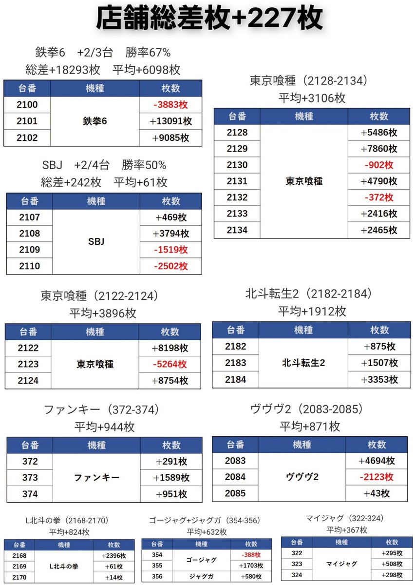 店舗総差枚+227枚