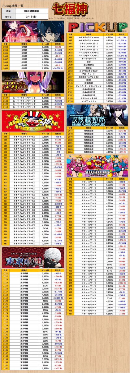 ➡️今回の推し機種は『化物語.SBJ.攻殻機動隊.東京喰種.ネオアイム.マイV』と今まで同様6機種見える結果となりましたね🐯🔎 https://twitter.com/reo_slotgroup/status/2021894374704181496