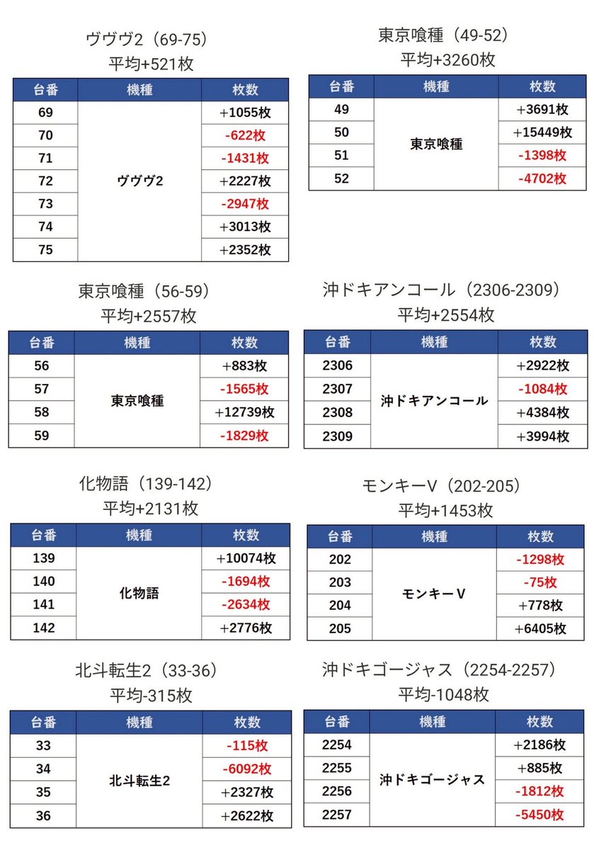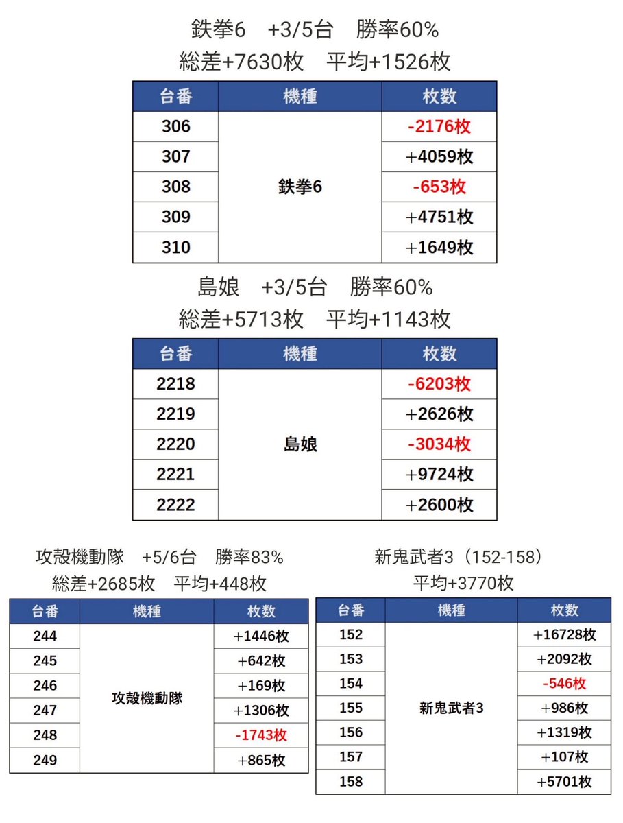 総差枚約+7,630枚(平均+1,526枚)