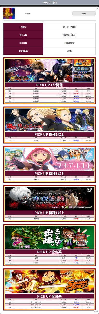 2/11(水) ピーアーク越谷 スロット差枚レポート