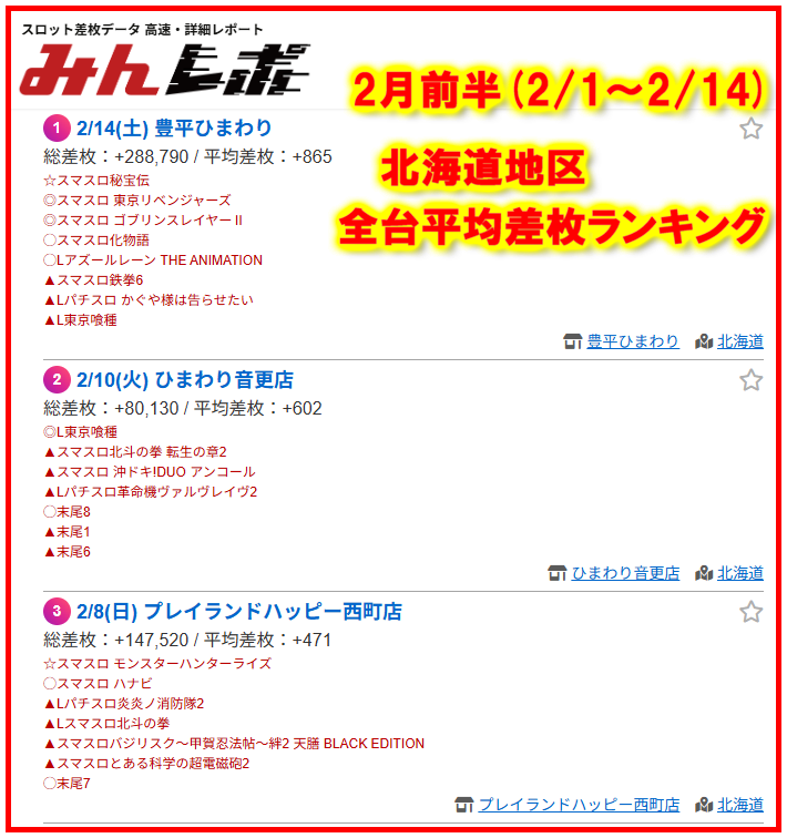 🗓️2/15 札幌出玉ランキング