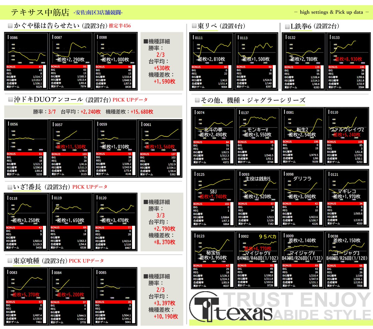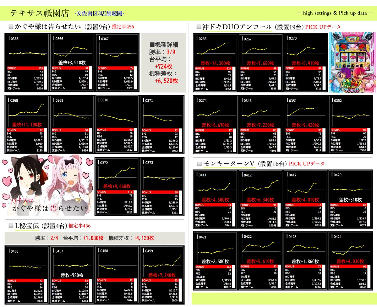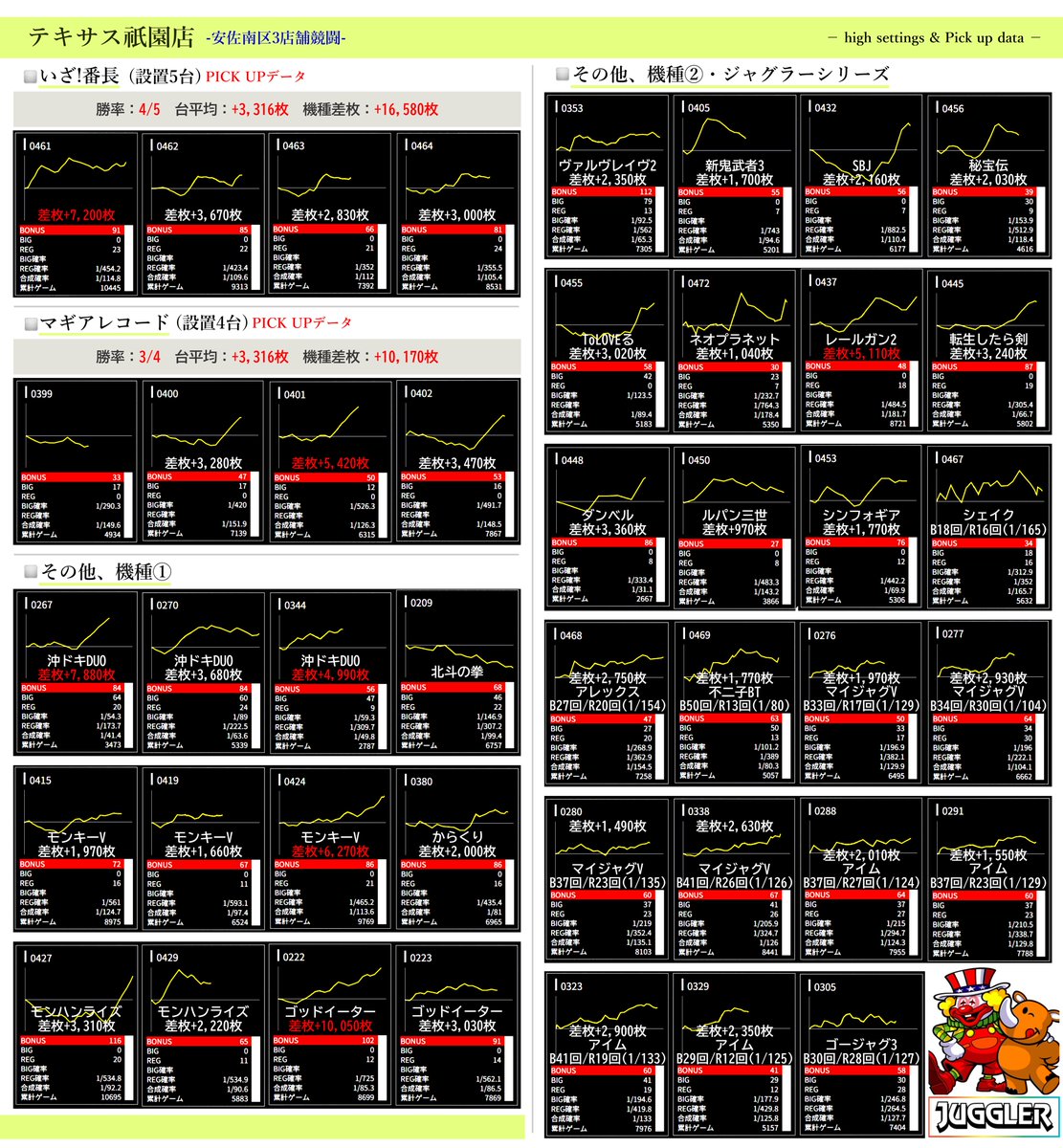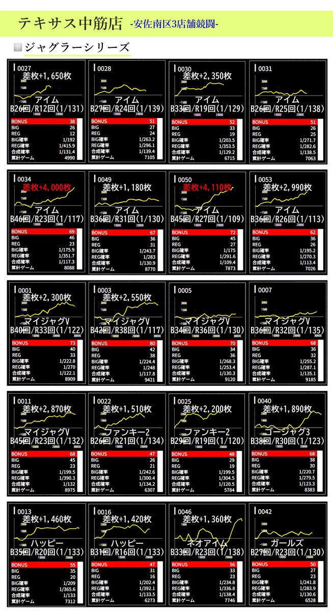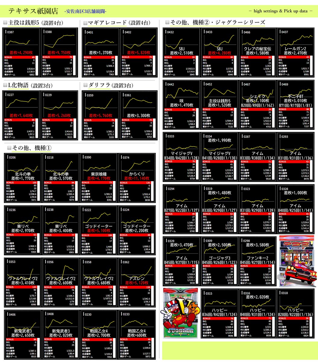 ⚠出ている台は多数ありますが、3店舗をまとめているので推定ヶ所や特に気になる台をピックアップしています。