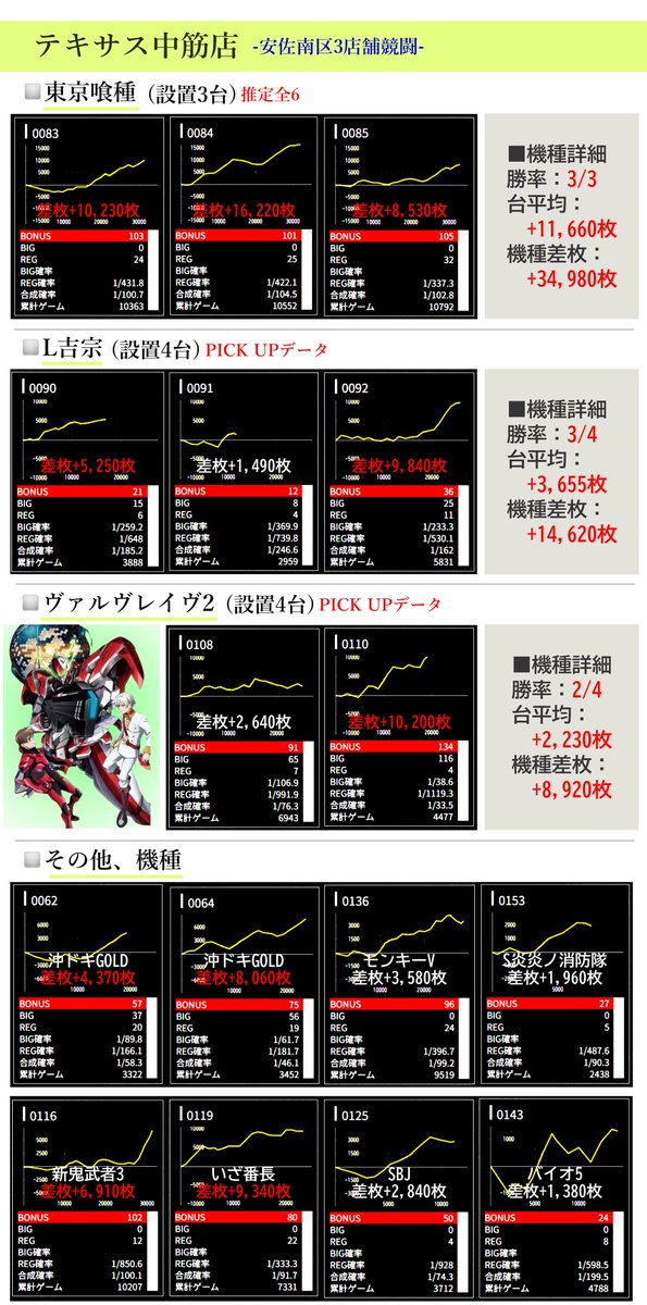 先日の安佐南区競闘でも全6(東京喰種・+11,660枚/1台)などメリハリで盛り上がっていた中筋店。